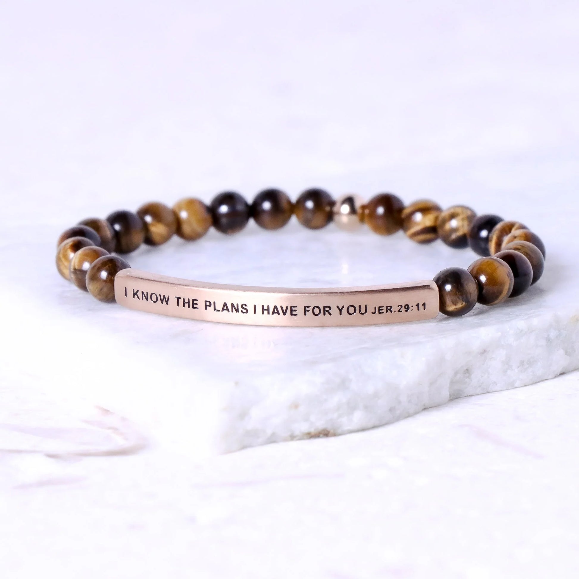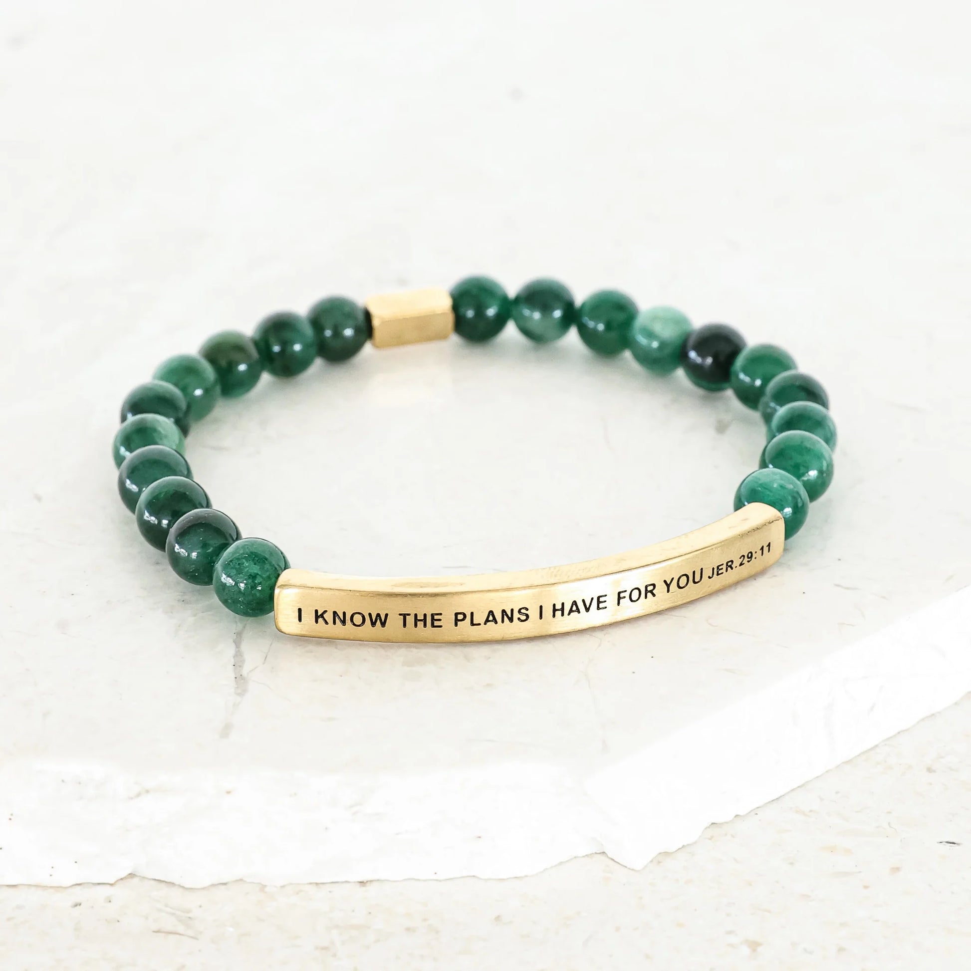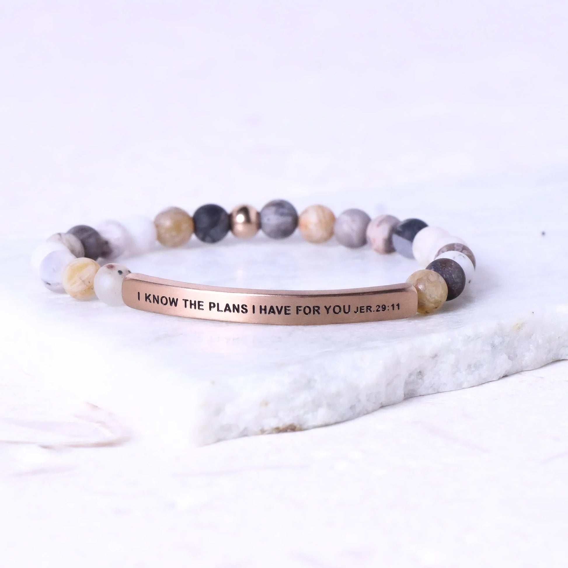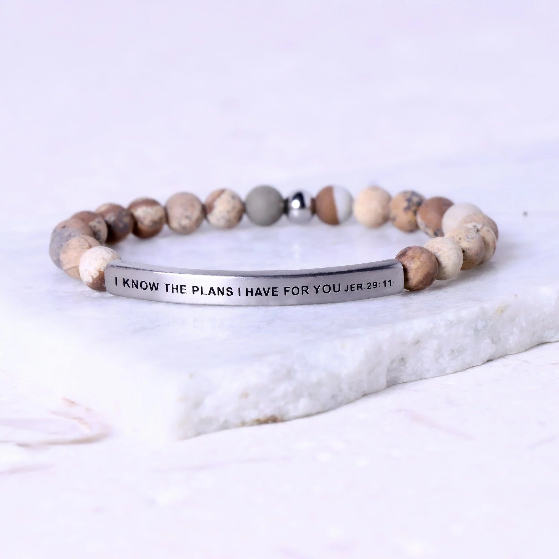 Our inspiration bracelets are beautiful reminders, crafted with 100% all-natural earth stone beads and an engraved stainless steel bar. Wear them throughout the day as a source of inspiration.